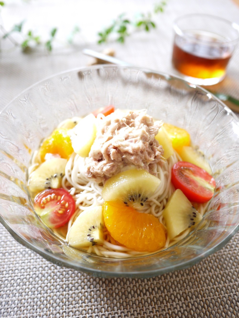 ツナとフルーツをそうめんにトッピングした斬新なそうめんのアレンジレシピです。ツナや甘いフルーツ・クリームチーズなど子供が好きなものをそうめんと組み合わせ、まるでスイーツのような料理になっています。クリームチーズをマヨネーズで代用したりと、子供の好みに合わせたアレンジも可能です。