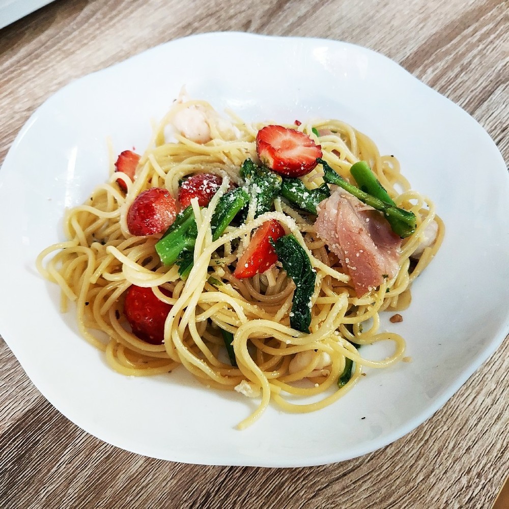 春が旬のいちごと菜の花を使って、パスタを作るのもおすすめです。いちごは形が崩れないように、仕上げにソースへ加えて短時間で火を通してください。いちごの酸味やオリーブオイルの香り、アンチョビの塩味のバランスがよく、風味豊かな一品です。
