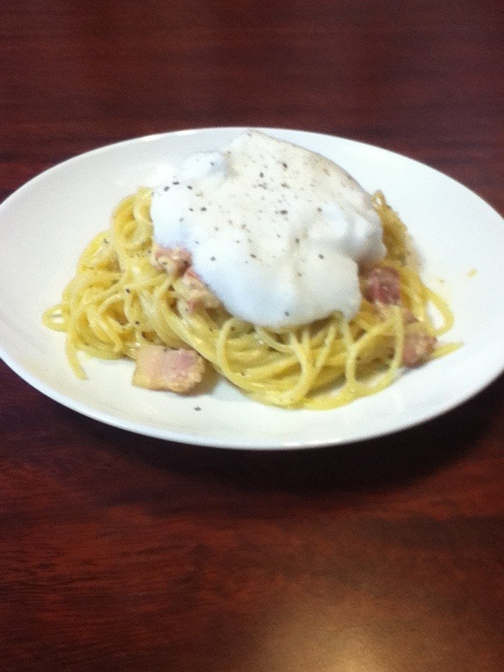 カルボナーラを作る際にホワイトソースに、白ワインを加えています。乾麺のパスタを茹でている間にメレンゲを作り、カルボナーラの上にのせたアレンジレシピはおもてなしメニューにもなると好評です。