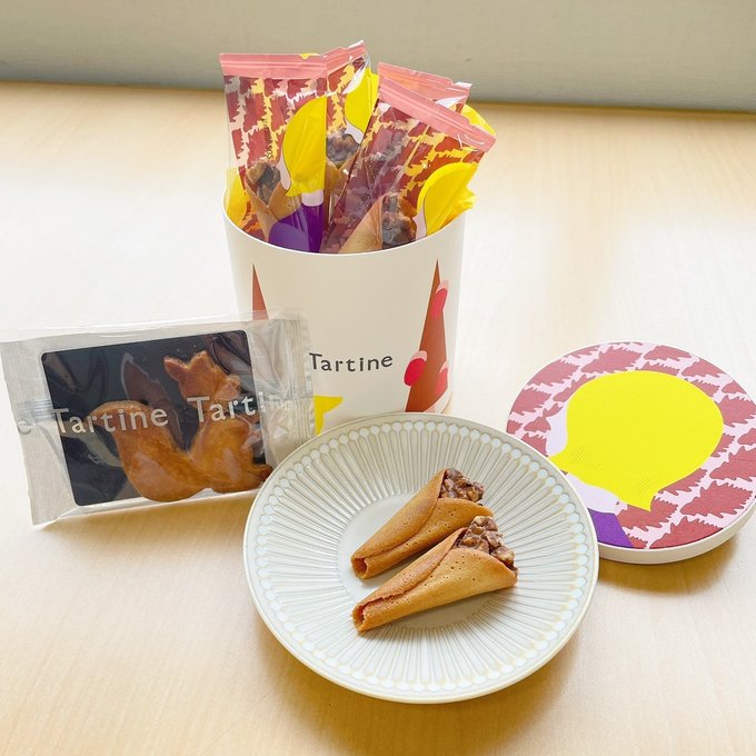 こちらは、タルティンのブーケと呼ばれるシリーズのなかでも秋限定の商品で、軽い食感のクッキー生地に香ばしいナッツを混ぜ込んだクリームが詰め込まれています。ブーケは他にもさまざまな種類があり、通常販売されているお菓子も人気です。