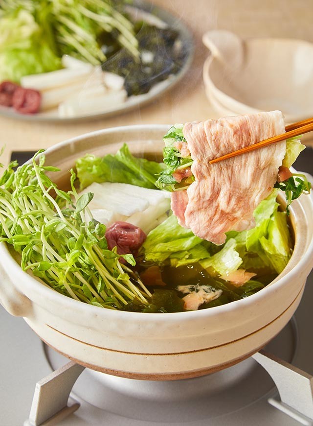 白だしに梅干しを入れて食べる豚しゃぶは、あっさりとした味わいで、大葉の爽やかさも後を引きます。入れる食材に決まりはありませんが、豆苗や水菜などを使っており、お財布に優しい鍋料理としても楽しめます。