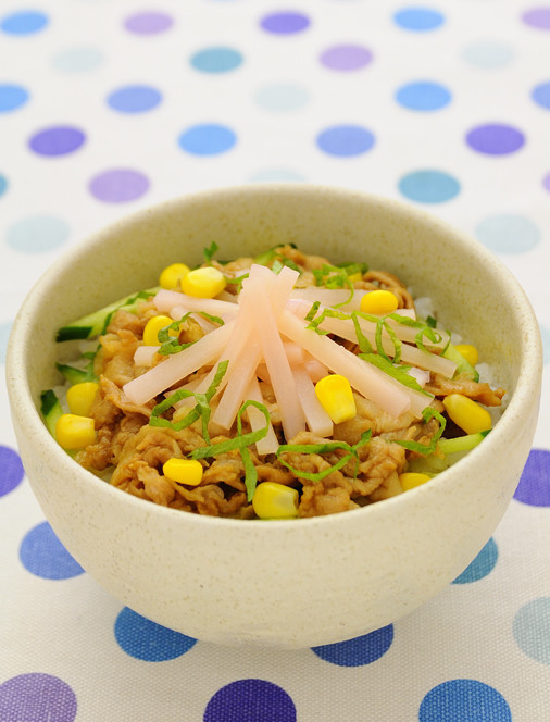 生姜が決め手のさっぱりとした豚丼は、焼肉のタレを使って味付けしてもくどさを感じません。コーンやきゅうりを使っているので、彩りが豊かできゅうりの爽やかな風味でより美味しく食べられます。