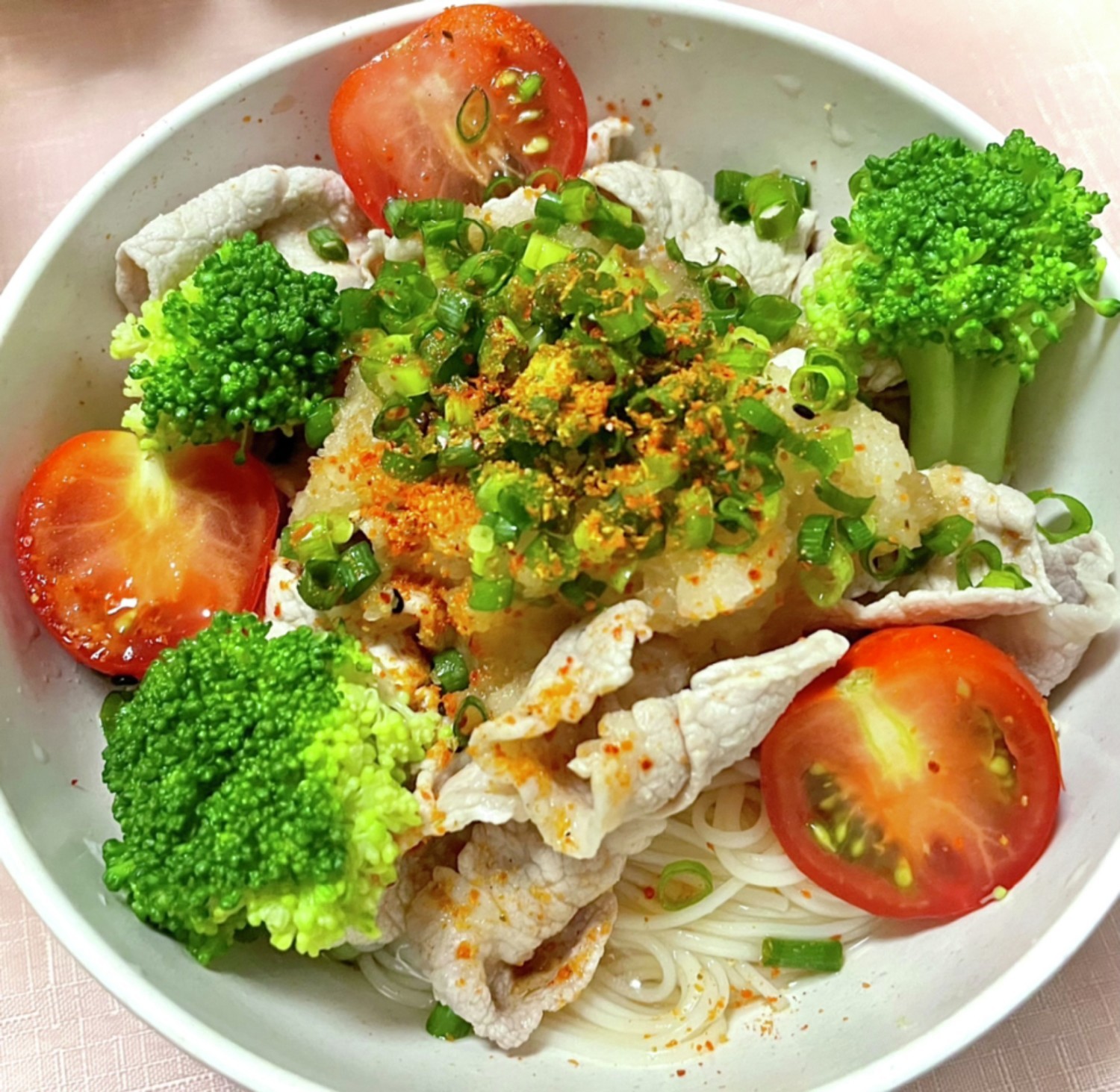 たっぷりの野菜とともに食べるぶっかけそうめんは、豚肉の上に大根おろしが乗っています。大根おろしは消化を助けてくれるため、夏バテしているときにも脂が多いバラ肉や豚こまでも、さっぱりと食べることができます。