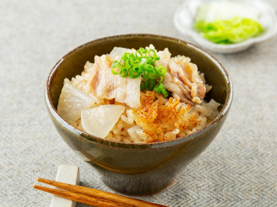 大根と豚バラ肉を具材に炊き込みご飯にした一品で、おかずの品数が少なくても満足できる献立になります。生姜を効かせているので爽やかな香りが食欲をそそり、くどさを感じず飽きずに食べられます。