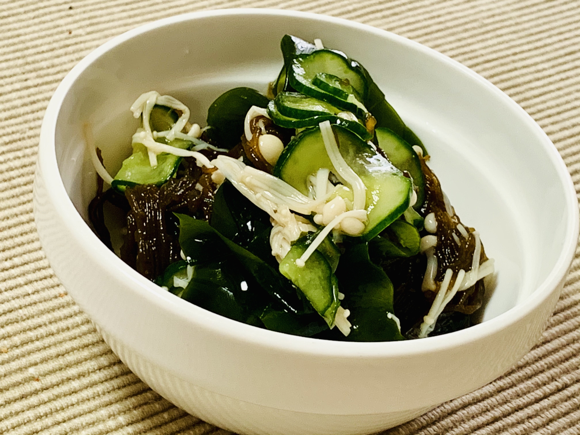 水で戻したわかめと生もずくと加熱したえのきを調味料で和えた、酢の物のレシピです。酢の物の味付けに使う酢と砂糖を、レモン汁とエリスリトールで代用することで、糖質を押さえることができます。