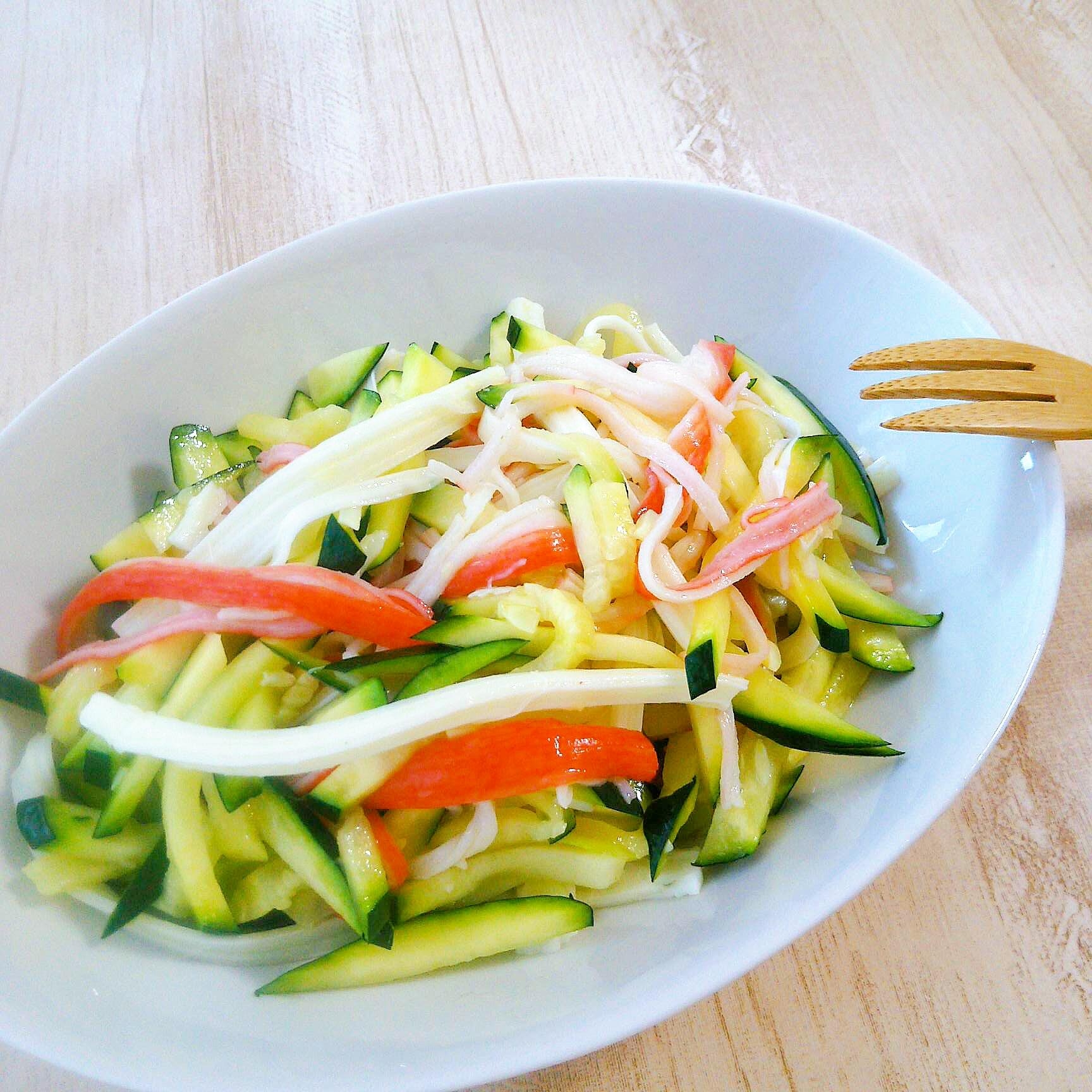 細切りにしたきゅうりとカニカマ・ズッキーニと裂いたさけるチーズを合わせて作る、カラフルなサラダのレシピです。柔らかいさけるチーズが、サラダの食感のアクセントになります。さけるチーズは塩味が強いため、オリーブオイルで和えるだけで味が決まります。