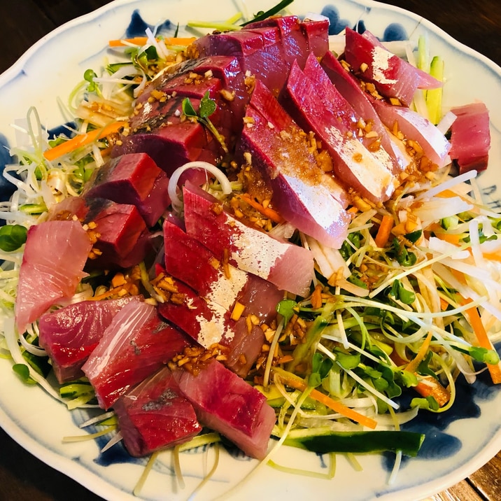 ツバスの刺身でボリュームのある料理を作りたい時は、サラダ仕立てにするのがおすすめです。野菜・ツバスの刺身の順に盛り付けたら、ごま油が効いた中華風のタレをかけます。仕上げに砕いたピーナッツをトッピングすると、食感のアクセントになります。