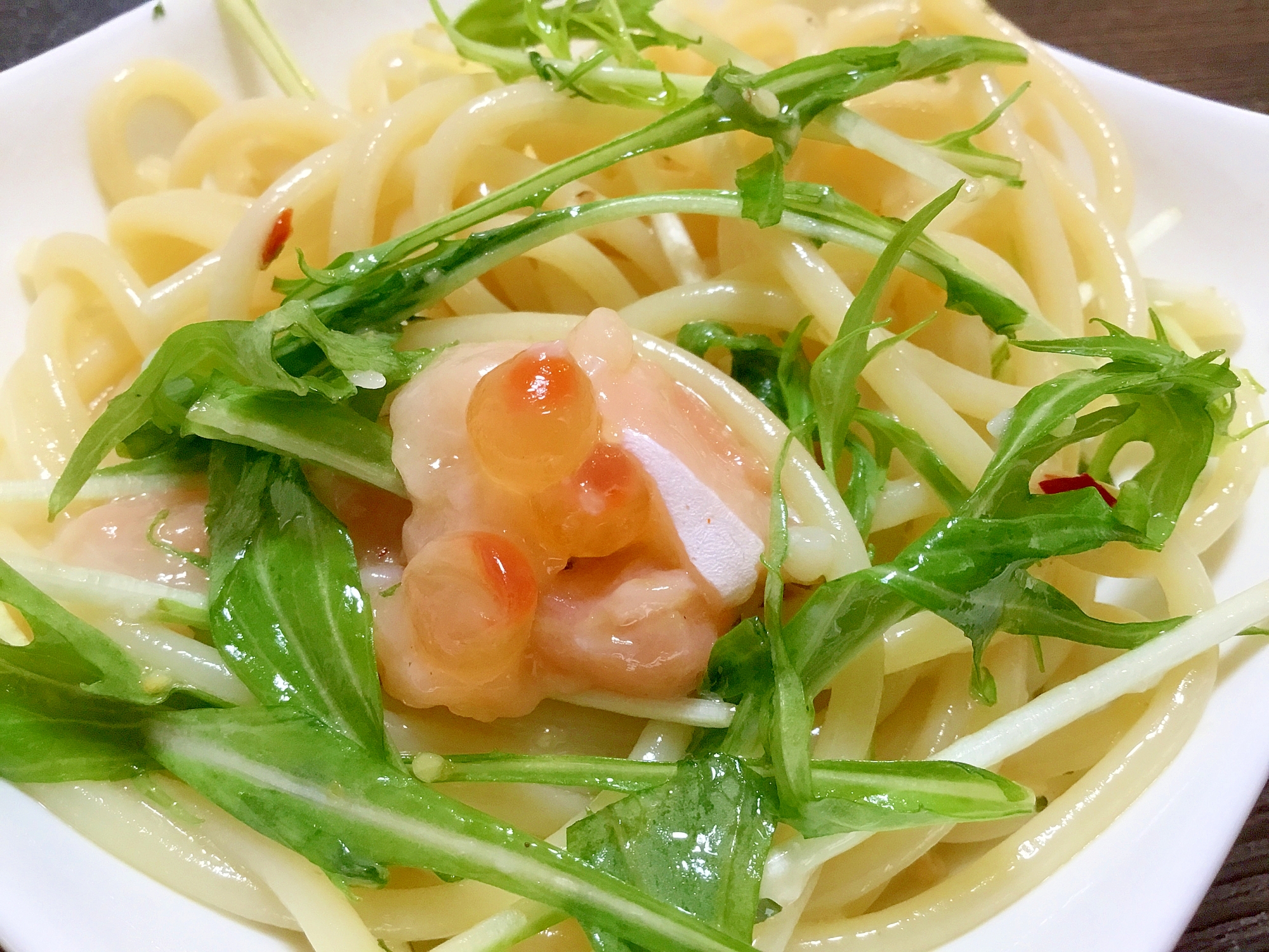水菜を使った和風パスタのレシピです。水菜の緑色とサーモンのピンク、いくらのオレンジが鮮やかなパスタは、見た目も楽しめます。好みでしそや刻みのりを加えるのもおすすめです。