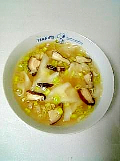 ぷりぷりの丸のままのえびを包んだワンタン5個と菜の花みたいな葉ものが入っていたんだけど
