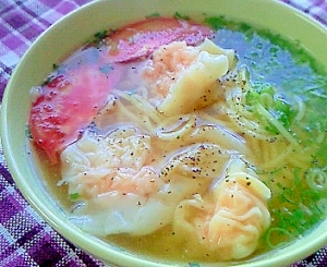 お水を注いでレンジで温めるとあっという間に豪華な海老ワンタンスープができます!
