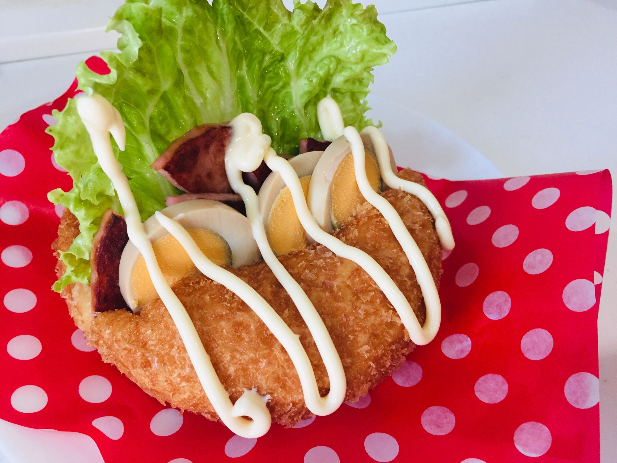 カレーパンにゆで卵とベーコンを挟んだサンドイッチのレシピです。持ち運びしやすいため、お弁当にも適しています。ベーコン以外に、ロースハムやソーセージなど、好みの食材でアレンジしてください。