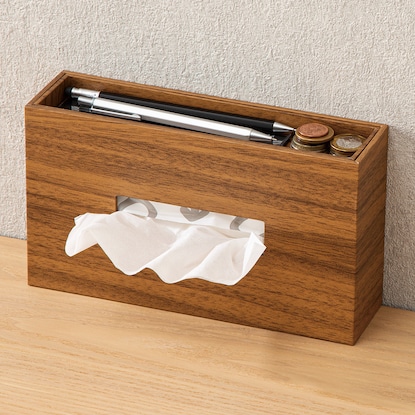 こちらは、樹液を採取した後のゴムの木の一種「ラバーウッド」を使用して作られているケースです。無印良品のティッシュペーパーだけでなく、市販のソフトパックティッシュも入れて使えます。木の蓋に重みがあるため、ティッシュを一枚ずつ取り出しやすくなっています。