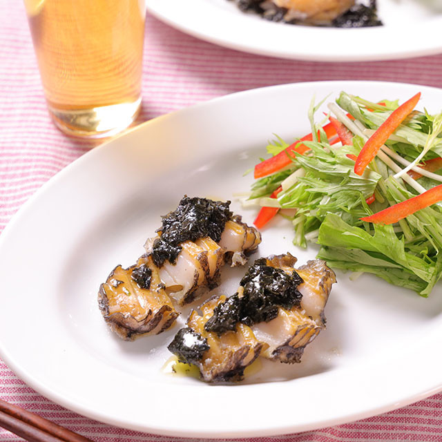 肝を使って作った醤油ソースが、クセになる一品です。日本酒との相性がぴったりなので、おつまみとしても喜ばれます。盛り付けは、ソースをあらかじめかけたお皿の上に、あわびを乗せると、おしゃれになります。
