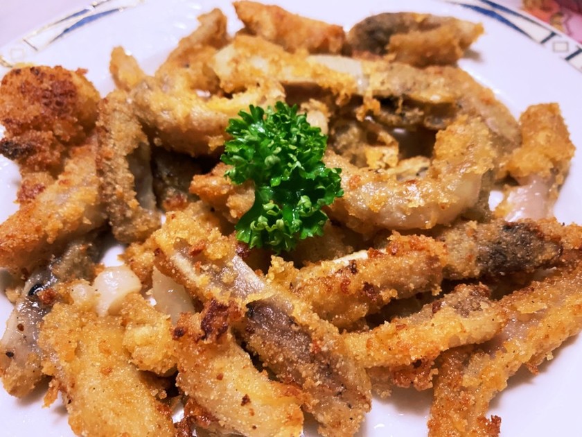 水が残っていると油がはねて危ないので、しっかり水気を切ってから、衣に付けて揚げます。あんこうは時間が経つと、水分が出てきて食感が変わりますので、早めに食べましょう。