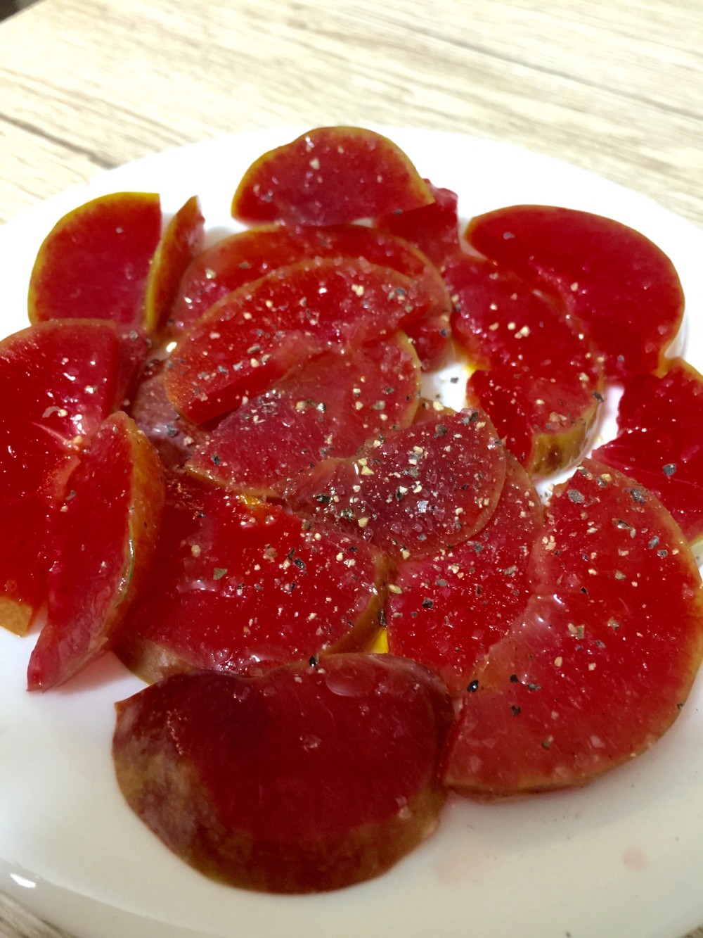 甘さが足りないソルダムを、お酒のおつまみにしたい時におすすめのメニューです。スライスしたソルダムに岩塩と黒胡椒をかけるだけなので、手早くおつまみを作りたい時に覚えておくと便利です。