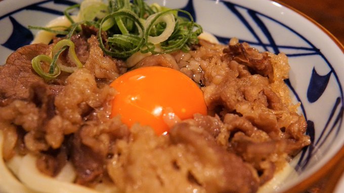 甘辛牛肉と濃厚玉子ともちもちうどんの黄金比をご覧ください。 #丸亀製麺 #飯テロ