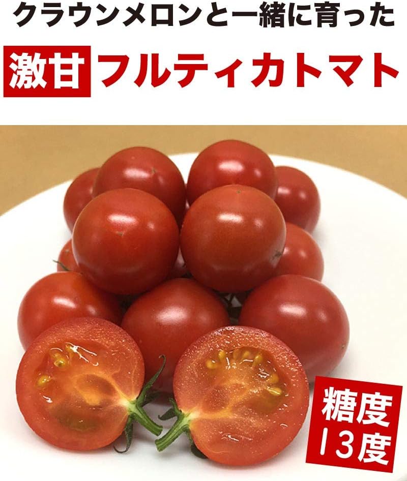 このフルーツトマトは、静岡県袋井市のクラウンメロンと一緒にガラス温室で栽培されています。肥料は通常の1/10に、水やりは通常の1/100に減らすことでトマトが持っている本来の力を発揮し、糖度は果物並みの13度にまで上がるそうです。