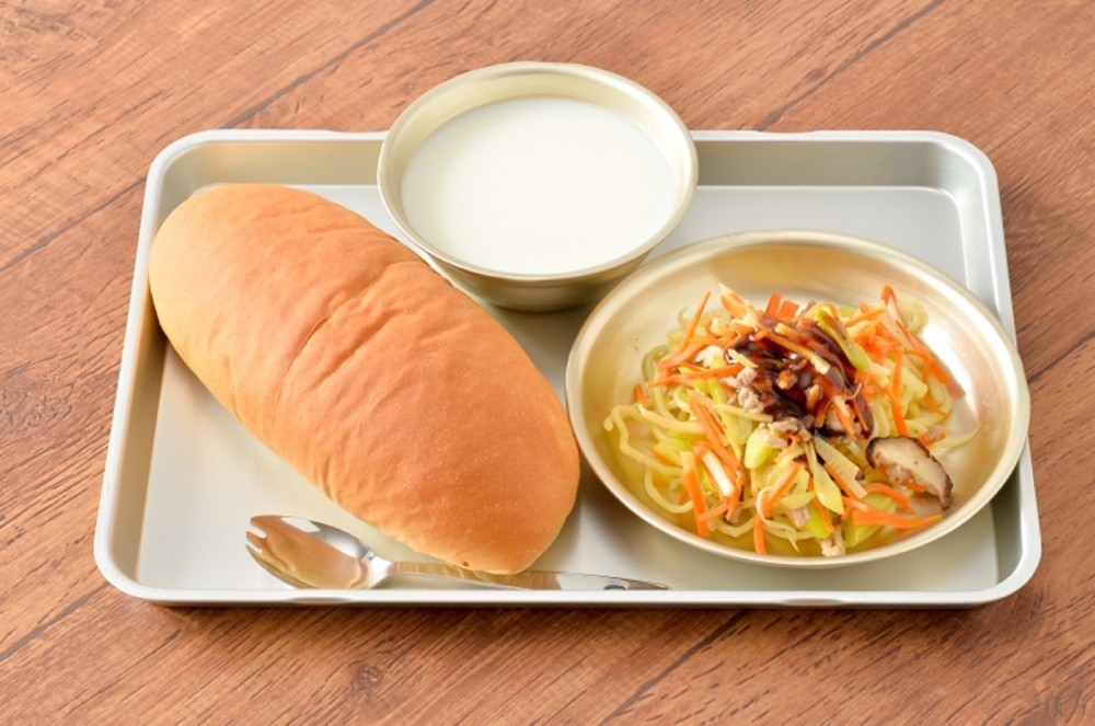 焼きそばに牛乳、コッペパンを合わせる簡単な献立ですが、食器をアルミに変えるなどの工夫で給食の雰囲気が再現できます。子供と一緒に楽しむイベントにもおすすめで、郷愁を誘う遊び心が感じられる食事ができるでしょう。