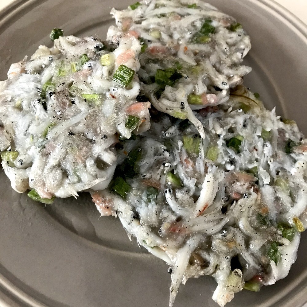 生しらすに小麦粉や紅生姜などを混ぜ、フライパンで焼いて作るおやきのレシピです。生地を焼く工程ではなるべく薄く広げて焼くと、軽い食感に仕上がります。完成したおやきに卵黄を絡めると、違った味わいが楽しめます。