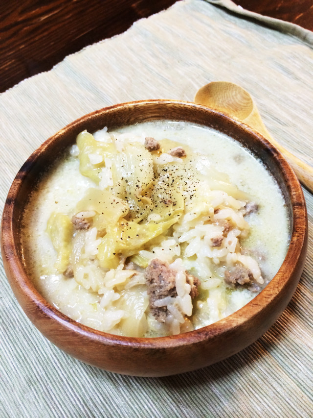 ロールキャベツに牛乳とチーズを加え、リゾットにした人気のリメイクレシピです。牛乳とチーズのコクのある風味と同時に、ロールキャベツの旨味が染みたご飯の味わいを感じられます。味が薄く感じる場合は、コンソメや塩などの調味料で調整しましょう。