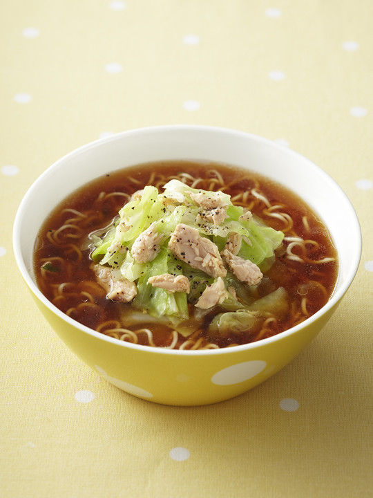 醤油ラーメンにマリネしたキャベツとレモンをトッピングするという、とても斬新なラーメンのアレンジレシピです。珍しい組み合わせですが、マリネしたキャベツとレモンが醤油ラーメンにとてもよく合いさっぱりとラーメンを食べる事ができます。キャベツを手でちぎって作るので、包丁いらず5分で作れるスピードメニューです。