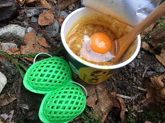 キャンプや登山用に荷物を減らす方法として、容器を外して袋に入れたまま作るカレーメシのレシピです。外でも食事を楽しめるよう、揚げ野菜をチップスにした市販品をトッピングにしています。歯ざわりの良い揚げ野菜の食感がよいアクセントになり美味しいです。