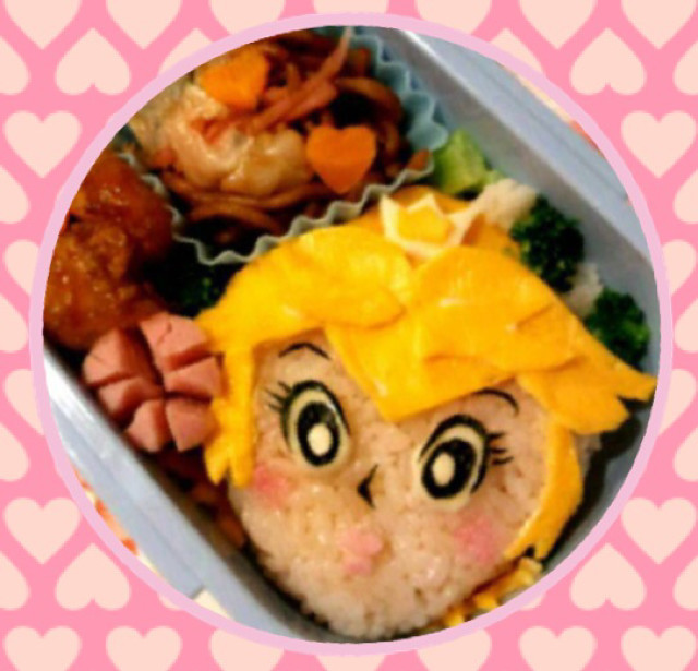 髪の毛は薄焼き卵で表現しており、ほっぺは桜でんぶでピンクに色付けています。髪型は型紙やイラストを見ながらカットすると綺麗に仕上がります。こちらは女の子にも喜ばれるレシピです。