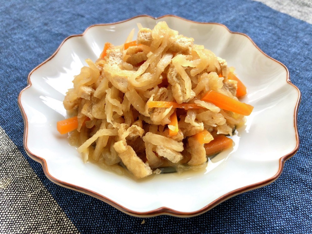 子供でも食べやすい野菜料理であるにんじんしりしりに、油揚げを加えるレシピです。和風のだしに醤油とみりんを加えているのでご飯にもよく合う副菜で、フライパン1つで作れる時短料理としても人気があります。